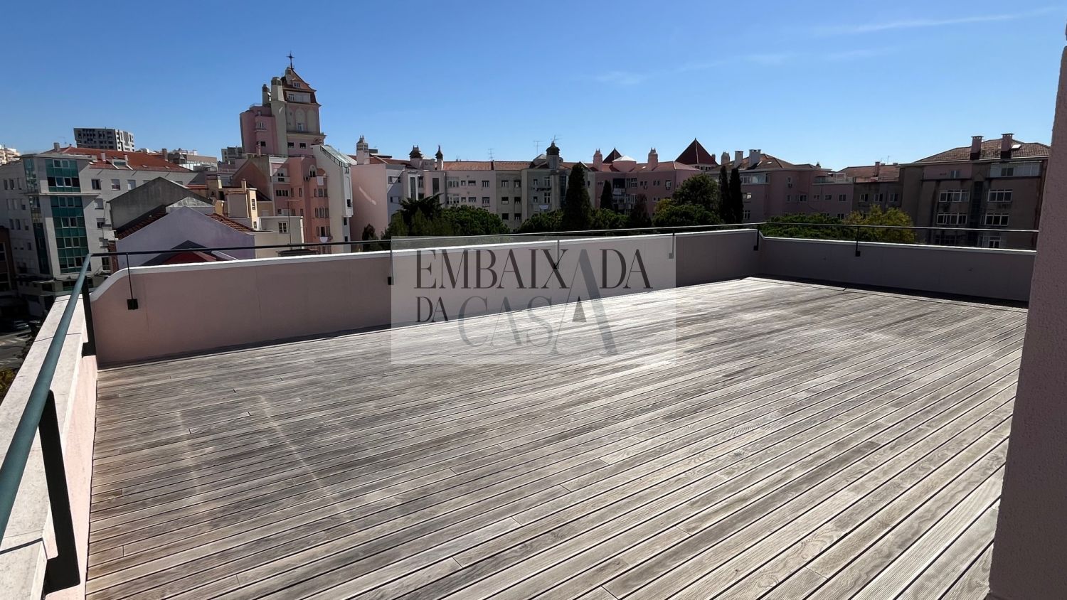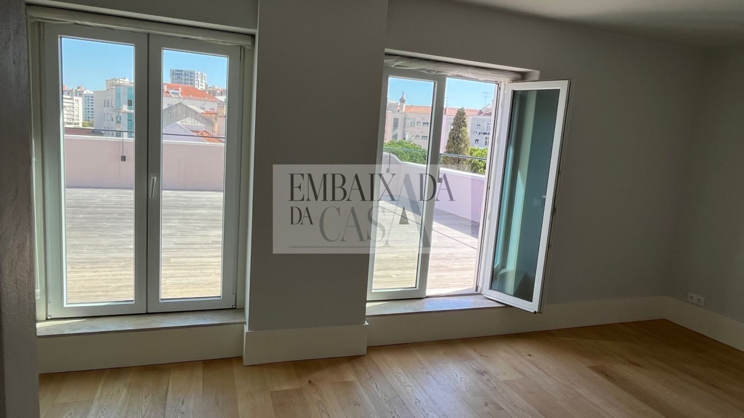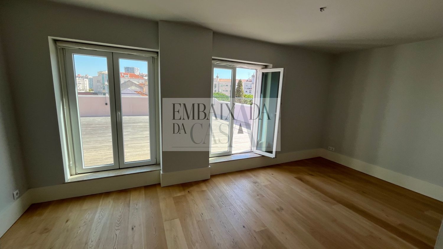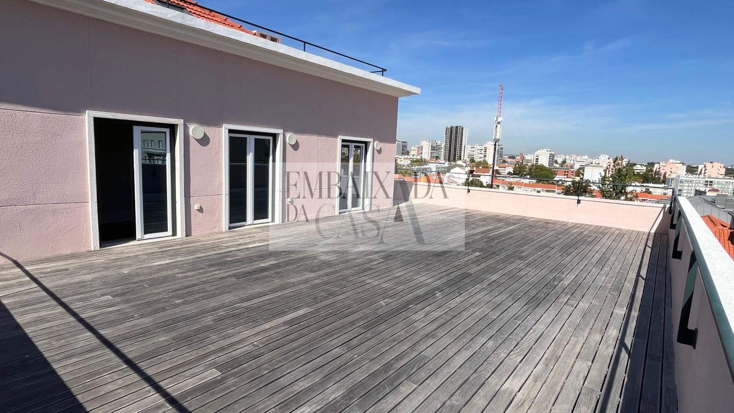 EMBAIXADA DA CASA | Apresenta apartamento T3 duplex no Areeiro, Av. Madrid, com fantástico terraço. Recentemente concluído, resulta da total recuperação (interior e exterior) de um prédio dos anos 50, preservando a sua traça exterior e o glamour das edificações da época. Apartamento duplex constituído por 3 quartos, dois dos quais em suite, um deles no piso superior. Dispõe de sala comum, de uma ampla cozinha e de um total de 3 casas de banho. Tem um generoso terraço com quase 100 m2, com vista fantástica 360 graus e privacidade, não estando muito próximo de nenhum prédio. O prédio tem um total de 5 andares e é servido por 2 elevadores novos, as traseiras dão para uma bonita e verdejante praceta que também é de estacionamento exclusivo para moradores. No piso térreo tem lojas com várias actividades em harmonia com a zona que fervilha com movimento e actividade. O Areeiro caracteriza-se por ser uma zona descontraída com apartamentos vintage em art déco e o popular Jardim Fernando Pessa, com trilhos calcetados que percorrem zonas de descanso florestadas e exibições de filmes ao ar livre no verão. Restaurantes informais, pastelarias e quiosques de gelados servem sobretudo famílias residentes e estudantes, enquanto os passageiros param para beber o café da manhã e cervejas depois do trabalho em redor do movimentado centro de transportes públicos na Estação Roma-Areeiro. ----------------------------- EMBAIXADA DA CASA | Presents 3 bedroom apartment in Areeiro, av. Madrid, with an amazing terrace. Already finished, it is the result of the total recovery (interior and exterior) of a building from the 50s, preserving its exterior design and the glamor of the buildings of the time. Duplex apartment consisting of 3 bedrooms, two of which are en suite, one on the upper floor. It has a common room, a good kitchen and a total of 3 bathrooms. It has a large terrace with almost 100 m2, with fantastic 360 degree views and privacy as it is not close to any building. The building has a total of 5 floors and is served by 2 elevators, the back faces a beautiful and green square that is also an exclusive parking for residents. On the ground floor there are shops with various activities in harmony with the area that buzzes with movement and activity. Areeiro is characterized by being a relaxed area with vintage art deco apartments and the popular Fernando Pessa Garden, with cobbled paths that run through forested rest areas and outdoor film screenings in summer. Casual restaurants, patisseries and ice cream kiosks cater mainly to resident families and students, while passengers stop for breakfast and beers after work around the busy public transport hub at Roma-Areeiro Station. The photographs are 3d projections of this project, illustrative of various fractions and typologies, not necessarily of this fraction.