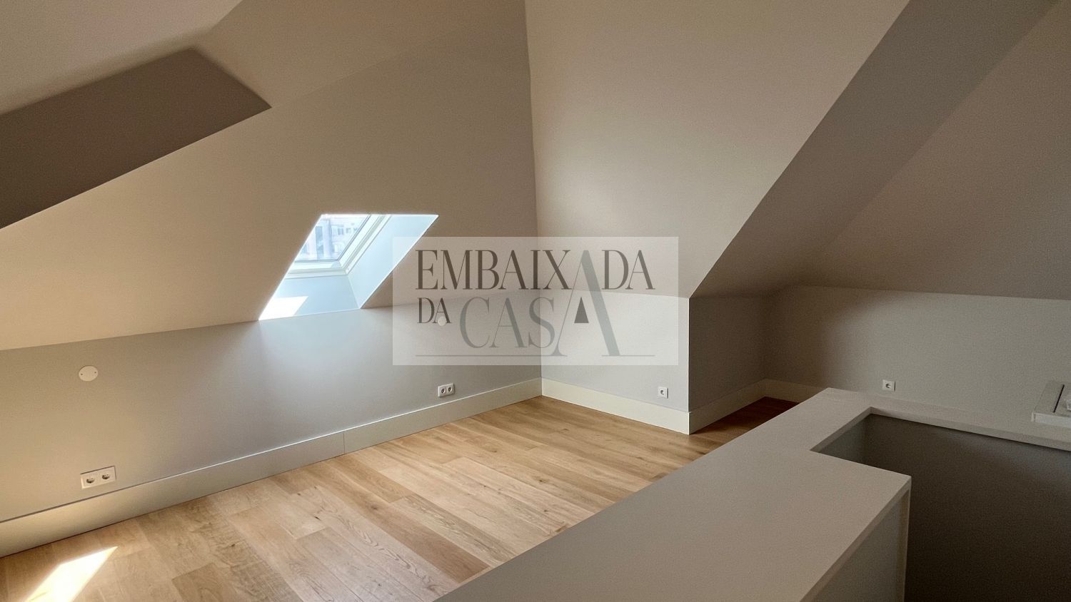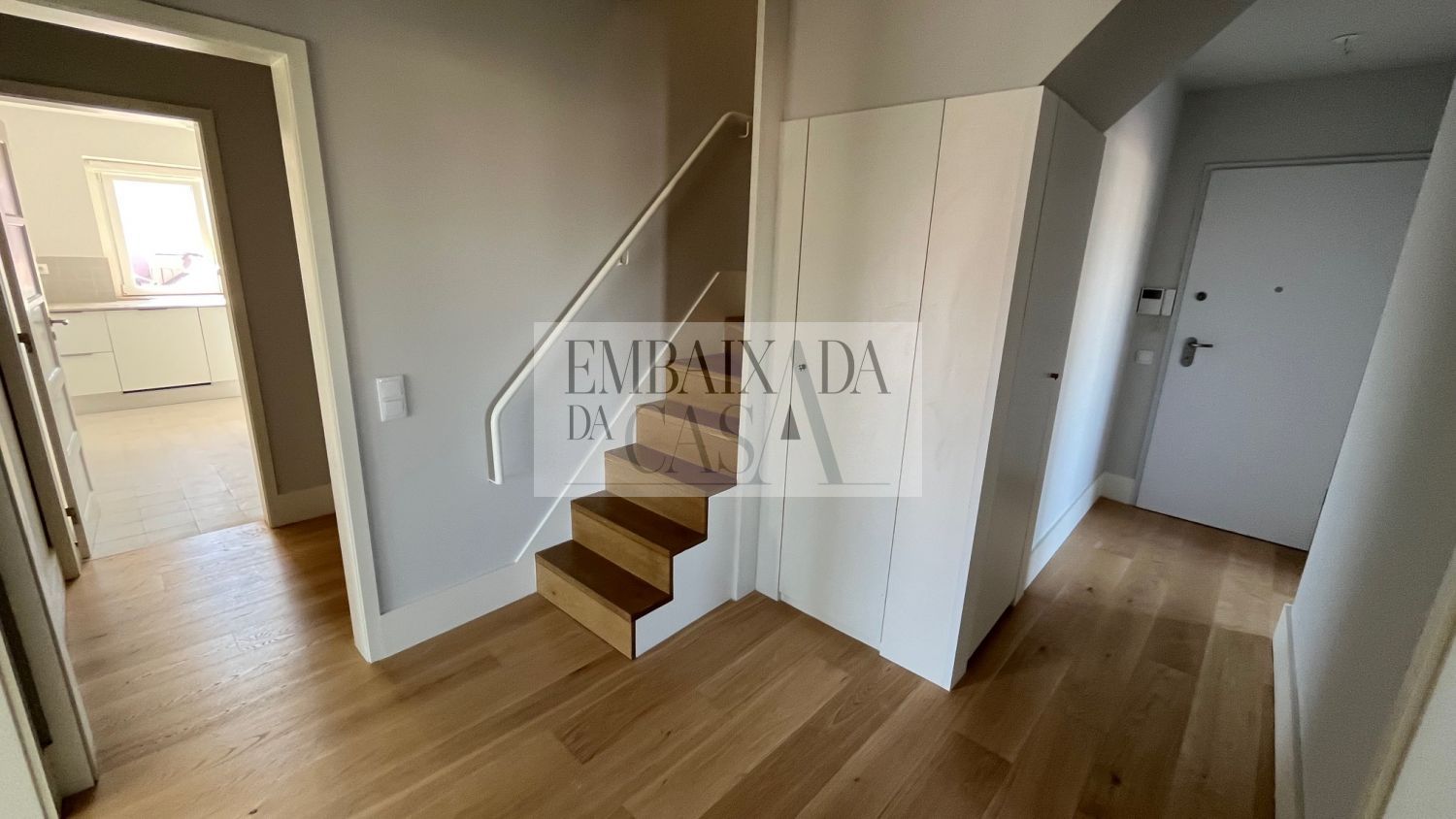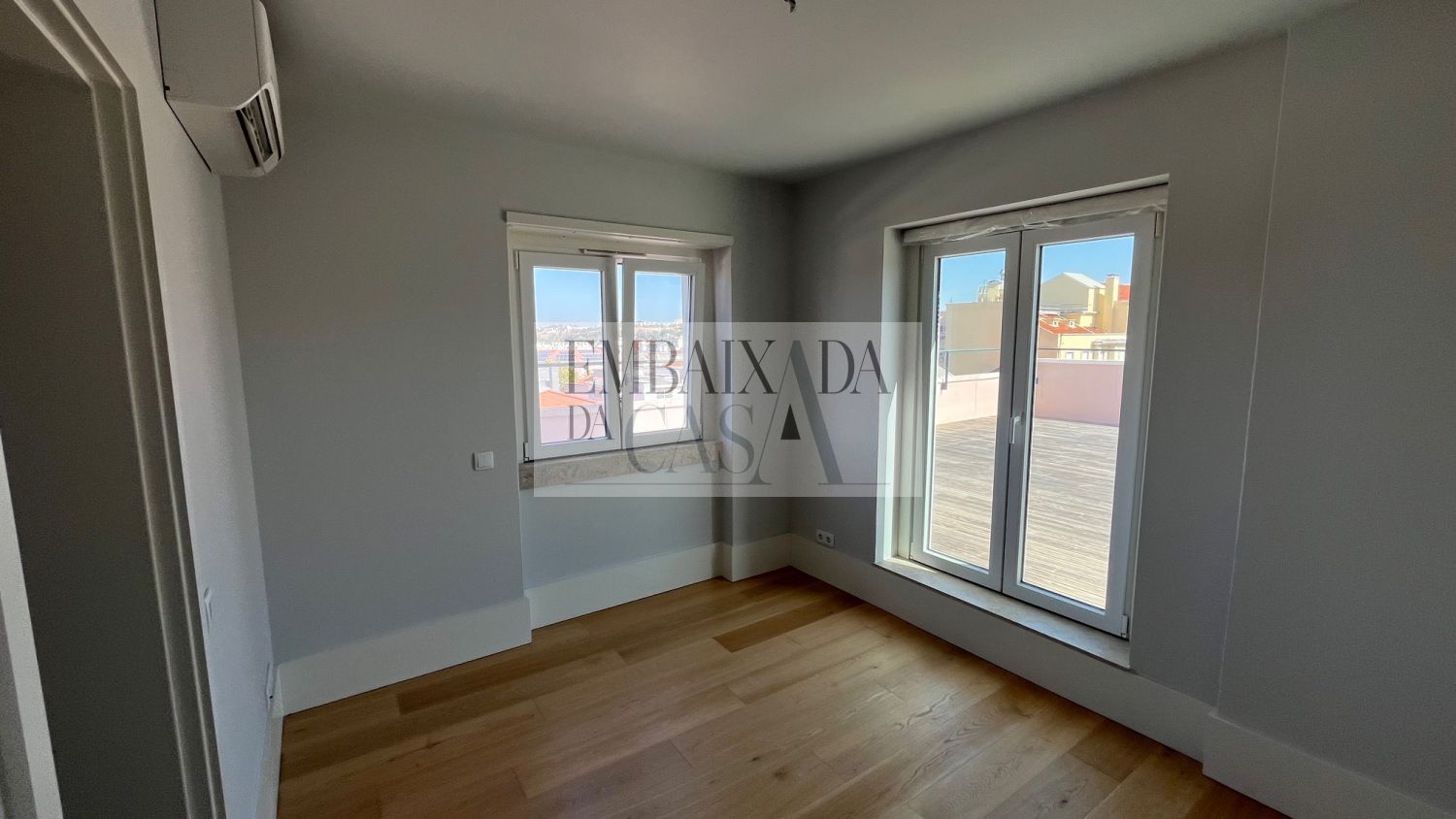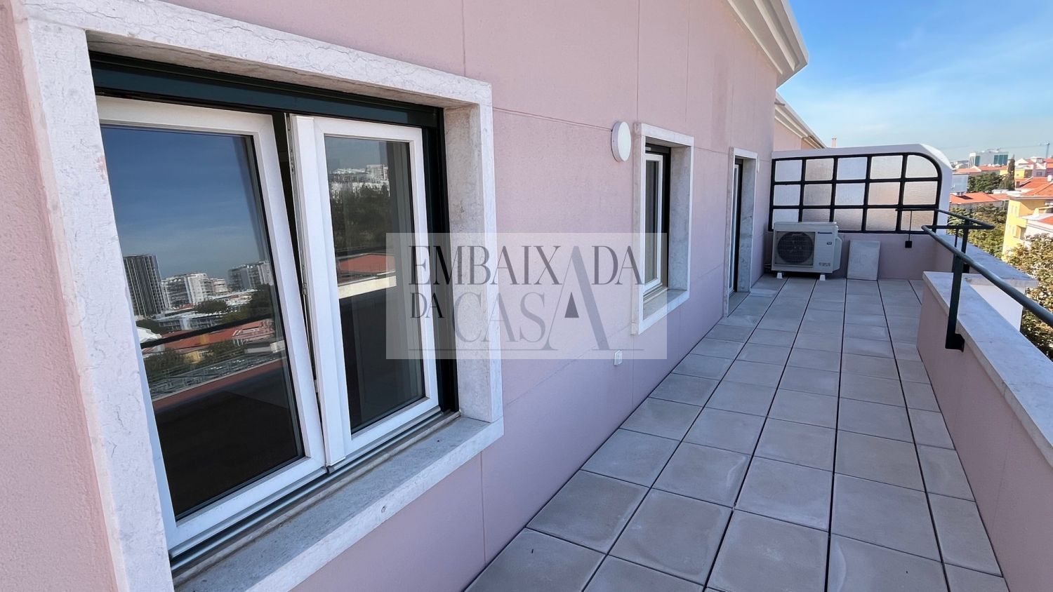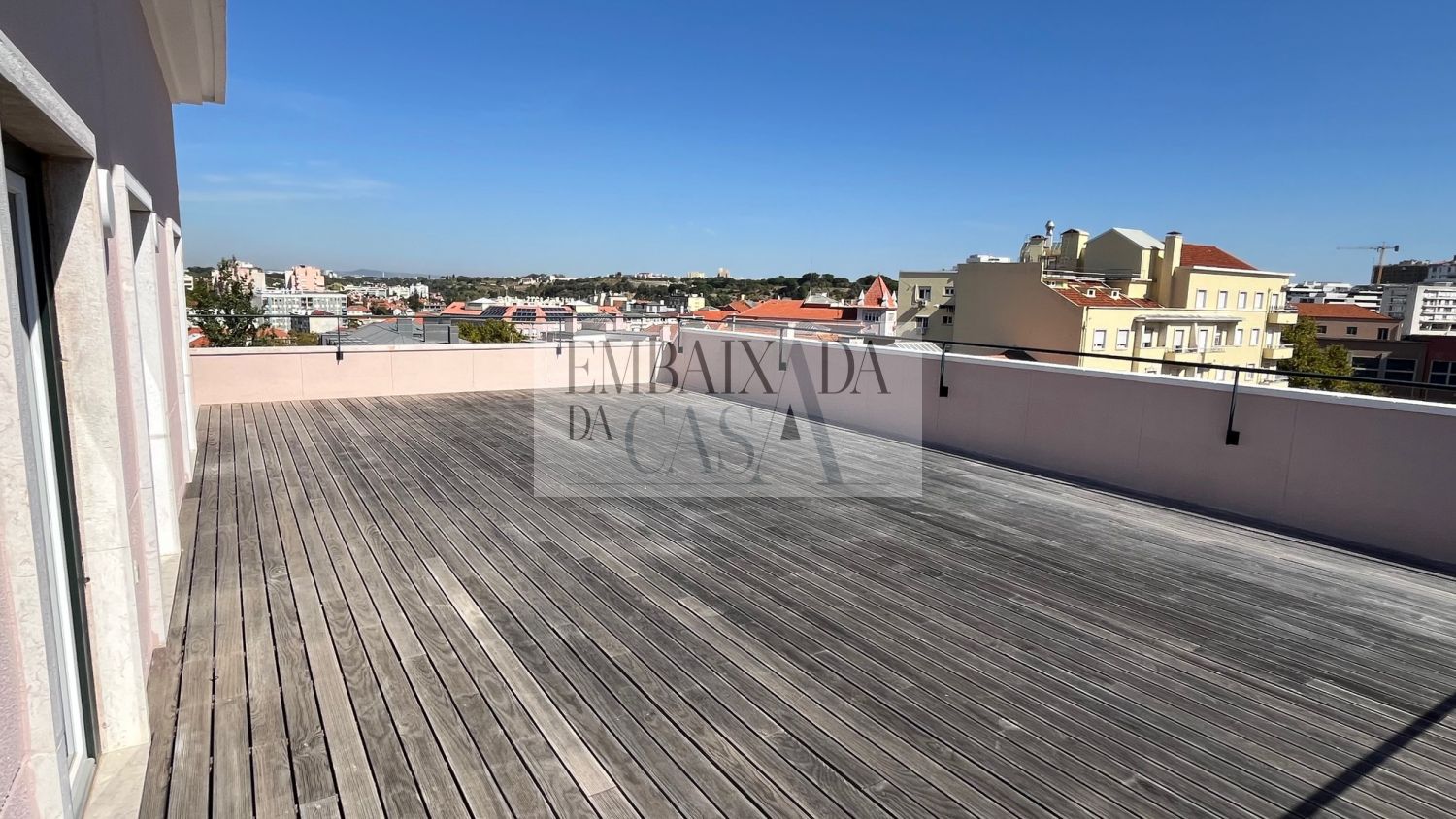 EMBAIXADA DA CASA | Apresenta apartamento T3 duplex no Areeiro, Av. Madrid, com fantástico terraço. Recentemente concluído, resulta da total recuperação (interior e exterior) de um prédio dos anos 50, preservando a sua traça exterior e o glamour das edificações da época. Apartamento duplex constituído por 3 quartos, dois dos quais em suite, um deles no piso superior. Dispõe de sala comum, de uma ampla cozinha e de um total de 3 casas de banho. Tem um generoso terraço com quase 100 m2, com vista fantástica 360 graus e privacidade, não estando muito próximo de nenhum prédio. O prédio tem um total de 5 andares e é servido por 2 elevadores novos, as traseiras dão para uma bonita e verdejante praceta que também é de estacionamento exclusivo para moradores. No piso térreo tem lojas com várias actividades em harmonia com a zona que fervilha com movimento e actividade. O Areeiro caracteriza-se por ser uma zona descontraída com apartamentos vintage em art déco e o popular Jardim Fernando Pessa, com trilhos calcetados que percorrem zonas de descanso florestadas e exibições de filmes ao ar livre no verão. Restaurantes informais, pastelarias e quiosques de gelados servem sobretudo famílias residentes e estudantes, enquanto os passageiros param para beber o café da manhã e cervejas depois do trabalho em redor do movimentado centro de transportes públicos na Estação Roma-Areeiro. ----------------------------- EMBAIXADA DA CASA | Presents 3 bedroom apartment in Areeiro, av. Madrid, with an amazing terrace. Already finished, it is the result of the total recovery (interior and exterior) of a building from the 50s, preserving its exterior design and the glamor of the buildings of the time. Duplex apartment consisting of 3 bedrooms, two of which are en suite, one on the upper floor. It has a common room, a good kitchen and a total of 3 bathrooms. It has a large terrace with almost 100 m2, with fantastic 360 degree views and privacy as it is not close to any building. The building has a total of 5 floors and is served by 2 elevators, the back faces a beautiful and green square that is also an exclusive parking for residents. On the ground floor there are shops with various activities in harmony with the area that buzzes with movement and activity. Areeiro is characterized by being a relaxed area with vintage art deco apartments and the popular Fernando Pessa Garden, with cobbled paths that run through forested rest areas and outdoor film screenings in summer. Casual restaurants, patisseries and ice cream kiosks cater mainly to resident families and students, while passengers stop for breakfast and beers after work around the busy public transport hub at Roma-Areeiro Station. The photographs are 3d projections of this project, illustrative of various fractions and typologies, not necessarily of this fraction.