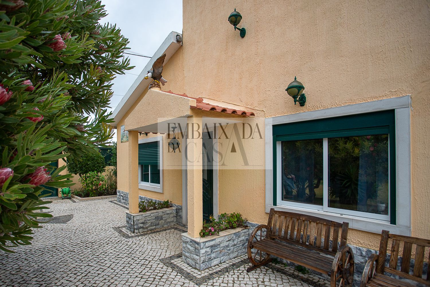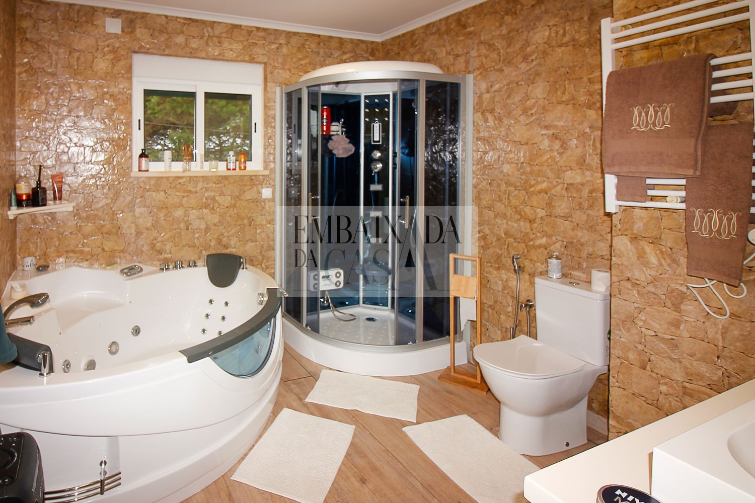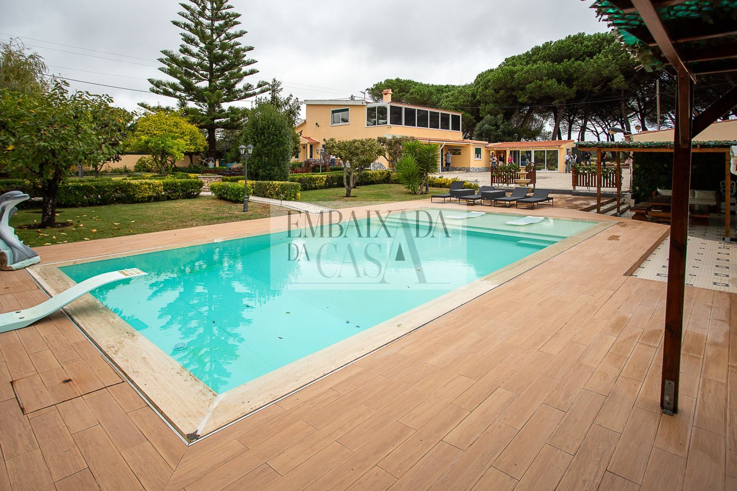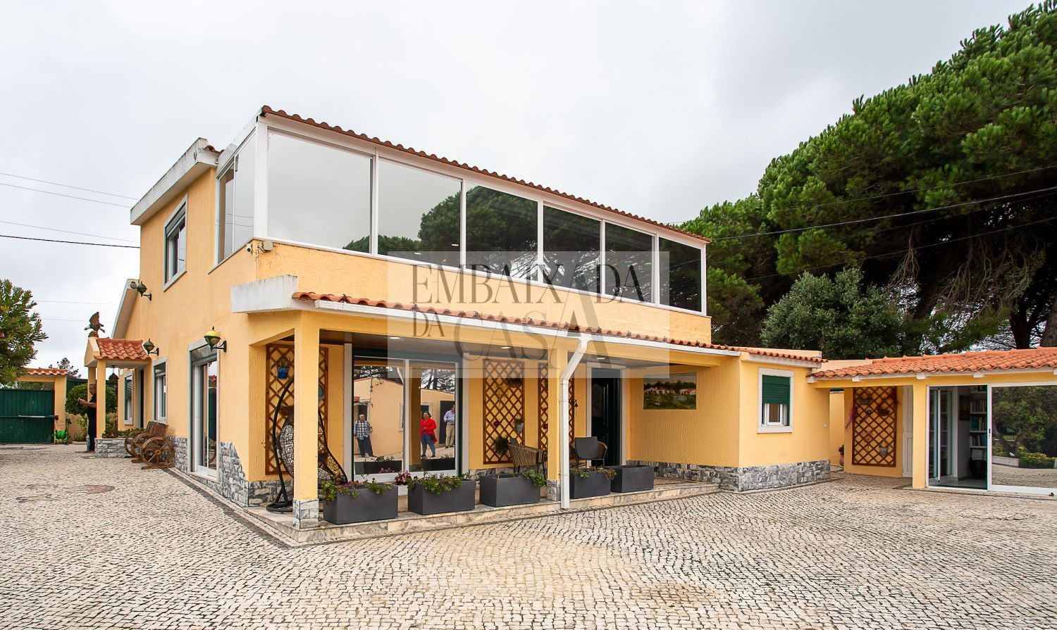 EMBAIXADA DA CASA | Apresenta Quinta c/ Moradia V3+2 e piscina, estando incluído mais um terreno rústico, com 840m2 em anexo. A quinta é constituída por a casa principal, jardim muito bem arranjado com diversas árvores, recantos românticos e passeios, vários anexos para garagem, biblioteca, zona de refeições no exterior coberta, piscina com 8m x 4m. O terreno tem uma área total de 1.651 m² : A moradia tem uma área de implantação: 346,8 m², com uma área bruta de construção de 341,1 m² e em áreas exteriores em anexos tem: 123,1 m². A moradia é constituída por: - PISO 0: Sala + cozinha em "open space" totalmente equipada com 48,7m2, mais lavandaria. Outra sala de estar com 17,75m2 com lareira com recuperador de calor, mais 3 Quartos, sendo um em Suíte 18,7m² com closet , casa de banho da suite com 3,9m² Base de duche, sanita e lavatório, aquecedor de toalhas; 2 quartos de 9,03m² e 9,15m², ambos c/ roupeiro; Uma casa de banho completa com 10,75m², lavatório duplo, banheira de hidromassagem, cabine hidromassagem, aquecedor de toalhas. - PISO 1: Salão "Spa" com 57,2m² com closet, Terraço fechado em marquise 20m²; casa de banho de serviço com 6,5m² com Lavatório, banheira de hidromassagem, cabine de hidromassagem, aquecedor de toalhas. Os aquecimentos elétricos individuais; estores elétricos, geridos por telefone; Sistema de Vídeo vigilância. - Exterior: Piscina de transbordo com jacuzzi, água aquecida e iluminada; Jardim com rega automática programada; Biblioteca + WC "Telheiro" 21,7m²; Sala 36,8m² "Arrumos" ; Garagem para 2 carros + Sala com 69,4m²; Arrumos, Canil com 7,2m²; Cozinha equipada de apoio à piscina 19,55m²; Pérgola; WC com Sauna 12,9m²; Casa de motor 4 m²; Furo. Portões automáticos de acesso aos veículos, Calçada Portuguesa nas zonas de circulação. Venda é feita em conjunto com lote de terreno rústico com a área total de 840m², junto à Quinta. Localizada perto de Sintra, com paisagens deslumbrantes, com vista para a Serra de Sintra, muitos bons acessos tanto para Lisboa como para todo o tipo de comércio, tanto de supermercados como de comércio local. As praias da zona de Sintra a Ericeira estão logo ali em escassos 10 minutos de carro. -------------------------------------------------- EMBAIXADA DA CASA | Presents Farm with 3+2 bedroom villa with swimming pool, including another rustic plot of land, with 840m2 attached. The farm consists of the main house, a very well-organized garden with several trees, romantic corners and walks, several outbuildings for a garage, library, covered outdoor dining area, swimming pool measuring 8m x 4m. The land has a total area of 1,651 m²: The house has a footprint: 346.8 m², with a gross construction area of 341.1 m² and in exterior areas in annexes it has: 123.1 m². The house consists of: - FLOOR 0: Living room + kitchen in "open space" fully equipped with 48.7 m2, plus laundry. Another living room with 17.75m2 with fireplace with stove, 3 more bedrooms, one of which is a 18.7m² suite with closet, bathroom in the suite with 3.9m² shower tray, toilet and sink, heated towel rail; 2 bedrooms measuring 9.03m² and 9.15m², both with wardrobes; A complete bathroom measuring 10.75 m², double sink, hydromassage bathtub, hydromassage cabin, towel warmer. - 1st FLOOR: "Spa" room with 57.2 m² with closet, 20 m² enclosed terrace in awning; service bathroom measuring 6.5 m² with sink, hydromassage bathtub, hydromassage cabin, towel warmer. Individual electric heaters; electric blinds, managed by telephone; Video surveillance system. - OUTSIDE: An overflow swimming pool with jacuzzi, heated and illuminated water; Garden with programmed automatic irrigation; Library + WC "Telheiro" 21.7m²; Room 36.8m² "Storage room"; Garage for 2 cars + Living room with 69.4m²; Storage, Kennel with 7.2m²; Equipped kitchen supporting the pool 19.55m²; Pergola; WC with Sauna 12.9m²; Motor house 4 m²; Hole. Automatic vehicle access gates, Portuguese sidewalk in circulation areas. Sale is made together with a plot of rustic land with a total area of 840m², next to the Quinta. Located near Sintra, with stunning landscapes, overlooking the Serra de Sintra, many good accesses to both Lisbon and all types of commerce, both supermarkets and local commerce. The beaches in the Sintra to Ericeira area are just a 10-minute drive away.