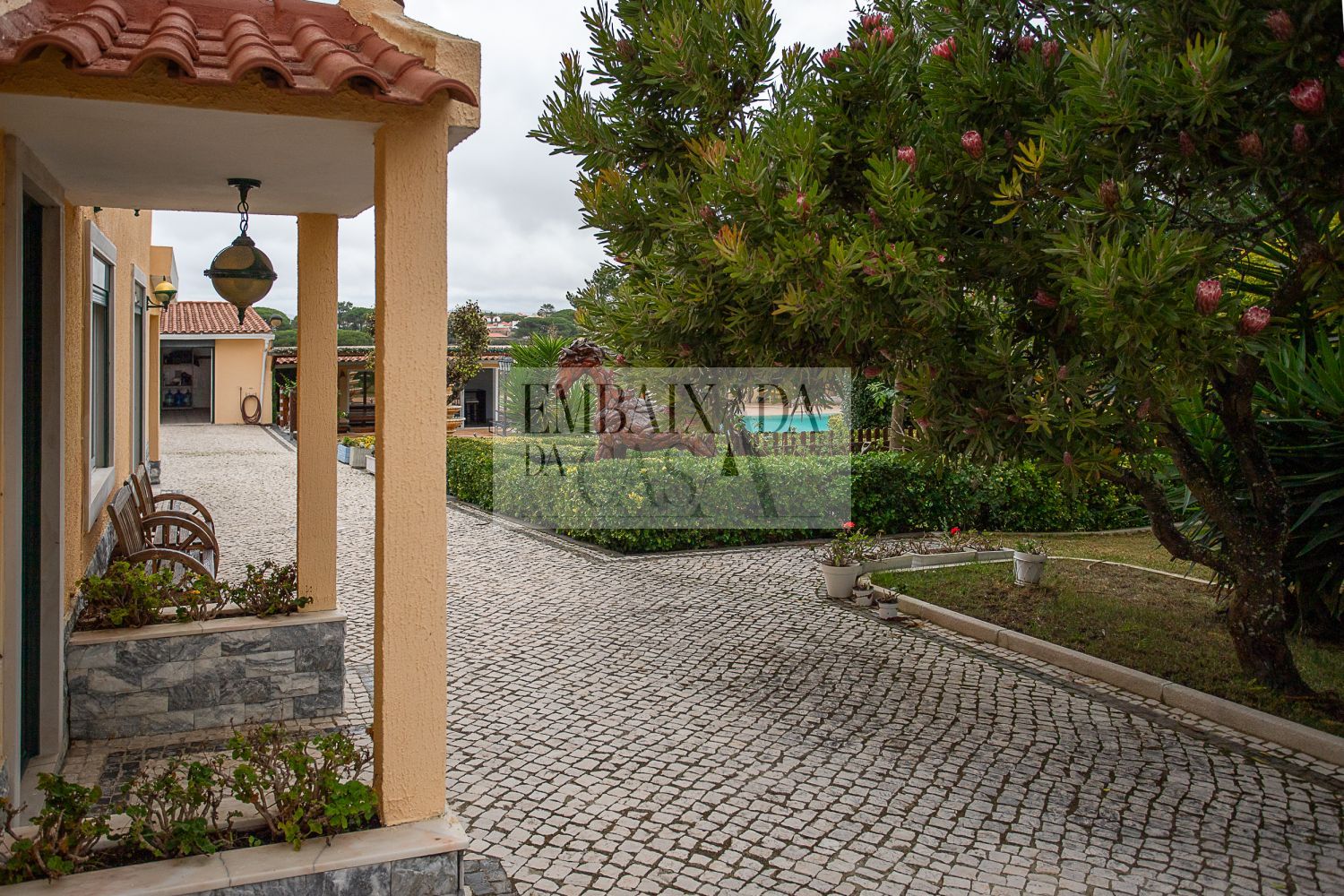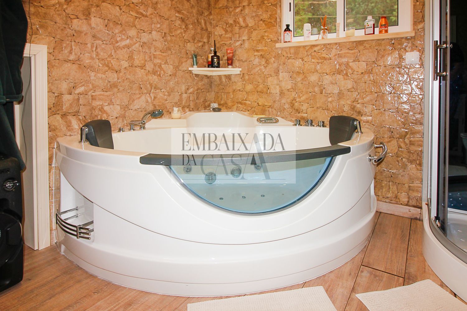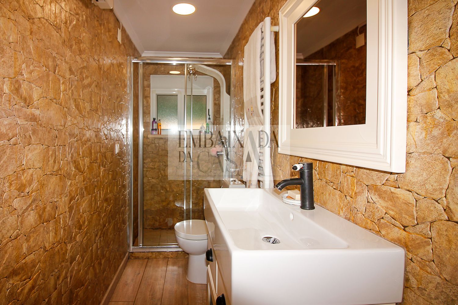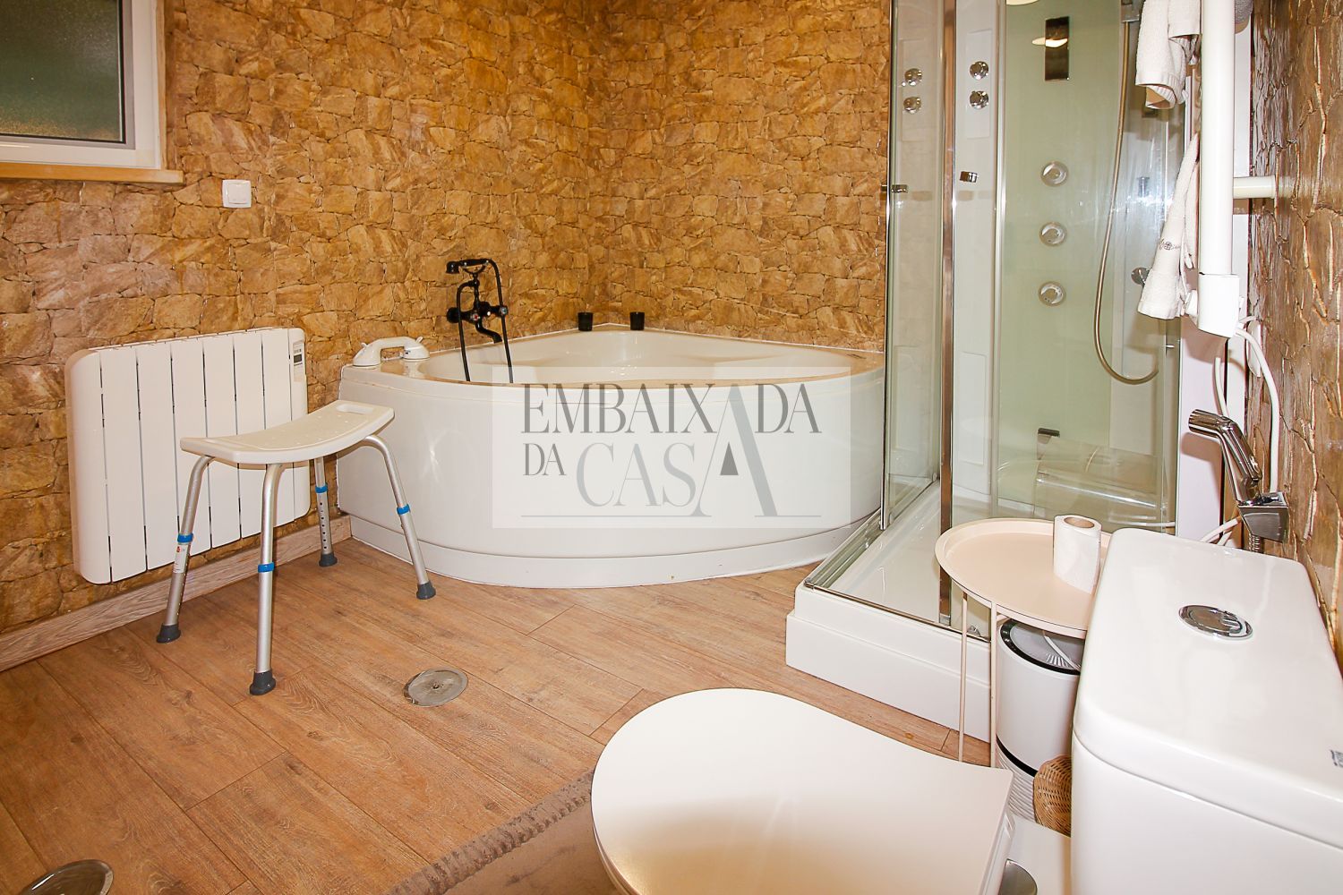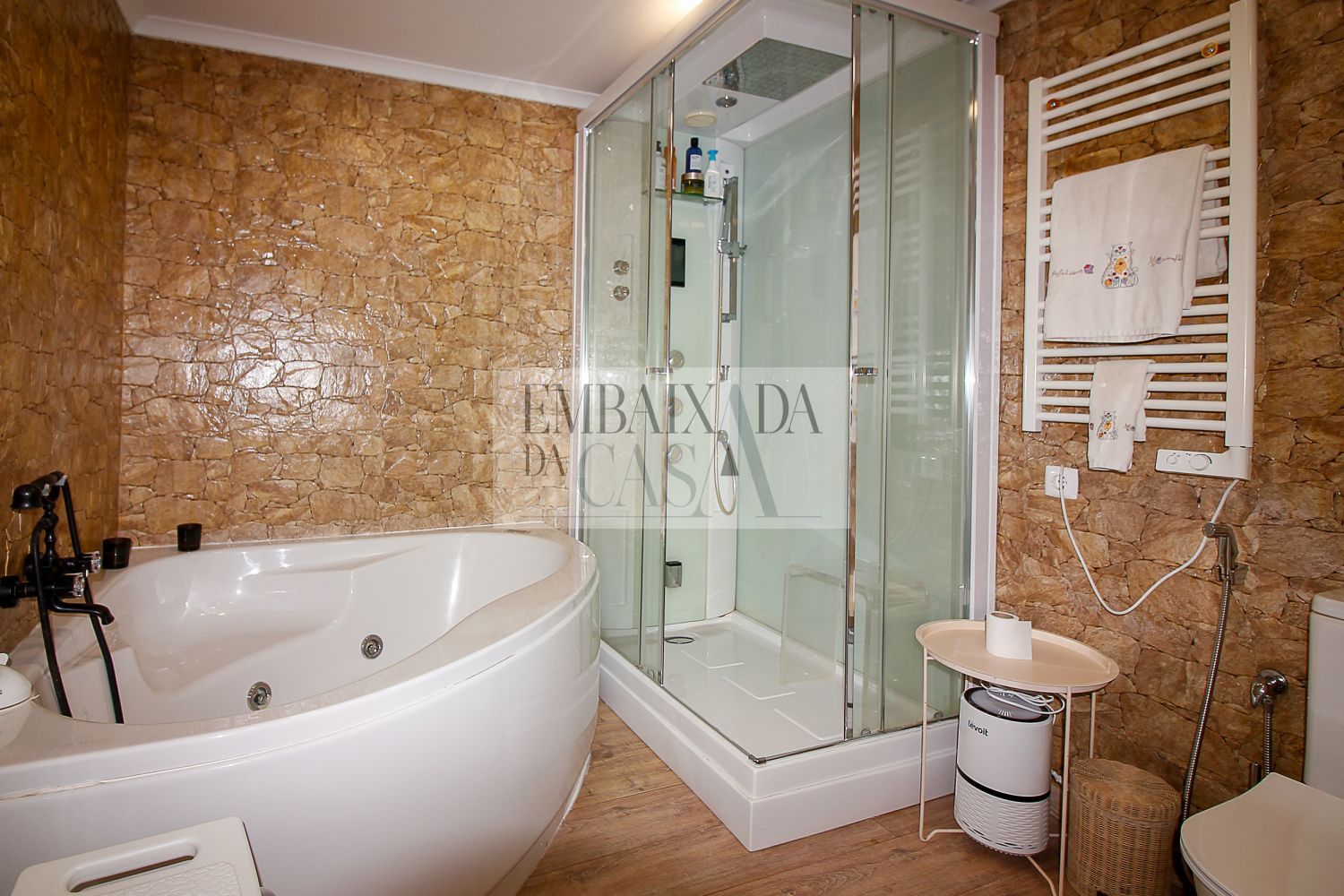 EMBAIXADA DA CASA | Apresenta Quinta c/ Moradia V3+2 e piscina, estando incluído mais um terreno rústico, com 840m2 em anexo. A quinta é constituída por a casa principal, jardim muito bem arranjado com diversas árvores, recantos românticos e passeios, vários anexos para garagem, biblioteca, zona de refeições no exterior coberta, piscina com 8m x 4m. O terreno tem uma área total de 1.651 m² : A moradia tem uma área de implantação: 346,8 m², com uma área bruta de construção de 341,1 m² e em áreas exteriores em anexos tem: 123,1 m². A moradia é constituída por: - PISO 0: Sala + cozinha em "open space" totalmente equipada com 48,7m2, mais lavandaria. Outra sala de estar com 17,75m2 com lareira com recuperador de calor, mais 3 Quartos, sendo um em Suíte 18,7m² com closet , casa de banho da suite com 3,9m² Base de duche, sanita e lavatório, aquecedor de toalhas; 2 quartos de 9,03m² e 9,15m², ambos c/ roupeiro; Uma casa de banho completa com 10,75m², lavatório duplo, banheira de hidromassagem, cabine hidromassagem, aquecedor de toalhas. - PISO 1: Salão "Spa" com 57,2m² com closet, Terraço fechado em marquise 20m²; casa de banho de serviço com 6,5m² com Lavatório, banheira de hidromassagem, cabine de hidromassagem, aquecedor de toalhas. Os aquecimentos elétricos individuais; estores elétricos, geridos por telefone; Sistema de Vídeo vigilância. - Exterior: Piscina de transbordo com jacuzzi, água aquecida e iluminada; Jardim com rega automática programada; Biblioteca + WC "Telheiro" 21,7m²; Sala 36,8m² "Arrumos" ; Garagem para 2 carros + Sala com 69,4m²; Arrumos, Canil com 7,2m²; Cozinha equipada de apoio à piscina 19,55m²; Pérgola; WC com Sauna 12,9m²; Casa de motor 4 m²; Furo. Portões automáticos de acesso aos veículos, Calçada Portuguesa nas zonas de circulação. Venda é feita em conjunto com lote de terreno rústico com a área total de 840m², junto à Quinta. Localizada perto de Sintra, com paisagens deslumbrantes, com vista para a Serra de Sintra, muitos bons acessos tanto para Lisboa como para todo o tipo de comércio, tanto de supermercados como de comércio local. As praias da zona de Sintra a Ericeira estão logo ali em escassos 10 minutos de carro. -------------------------------------------------- EMBAIXADA DA CASA | Presents Farm with 3+2 bedroom villa with swimming pool, including another rustic plot of land, with 840m2 attached. The farm consists of the main house, a very well-organized garden with several trees, romantic corners and walks, several outbuildings for a garage, library, covered outdoor dining area, swimming pool measuring 8m x 4m. The land has a total area of 1,651 m²: The house has a footprint: 346.8 m², with a gross construction area of 341.1 m² and in exterior areas in annexes it has: 123.1 m². The house consists of: - FLOOR 0: Living room + kitchen in "open space" fully equipped with 48.7 m2, plus laundry. Another living room with 17.75m2 with fireplace with stove, 3 more bedrooms, one of which is a 18.7m² suite with closet, bathroom in the suite with 3.9m² shower tray, toilet and sink, heated towel rail; 2 bedrooms measuring 9.03m² and 9.15m², both with wardrobes; A complete bathroom measuring 10.75 m², double sink, hydromassage bathtub, hydromassage cabin, towel warmer. - 1st FLOOR: "Spa" room with 57.2 m² with closet, 20 m² enclosed terrace in awning; service bathroom measuring 6.5 m² with sink, hydromassage bathtub, hydromassage cabin, towel warmer. Individual electric heaters; electric blinds, managed by telephone; Video surveillance system. - OUTSIDE: An overflow swimming pool with jacuzzi, heated and illuminated water; Garden with programmed automatic irrigation; Library + WC "Telheiro" 21.7m²; Room 36.8m² "Storage room"; Garage for 2 cars + Living room with 69.4m²; Storage, Kennel with 7.2m²; Equipped kitchen supporting the pool 19.55m²; Pergola; WC with Sauna 12.9m²; Motor house 4 m²; Hole. Automatic vehicle access gates, Portuguese sidewalk in circulation areas. Sale is made together with a plot of rustic land with a total area of 840m², next to the Quinta. Located near Sintra, with stunning landscapes, overlooking the Serra de Sintra, many good accesses to both Lisbon and all types of commerce, both supermarkets and local commerce. The beaches in the Sintra to Ericeira area are just a 10-minute drive away.